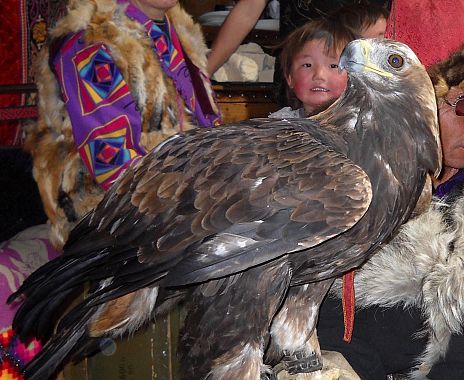 Un'ora dopo arrivammo su un altopiano dove si trovavano tre gher. L'uomo ci invitò a scendere, ci presentò la moglie e i figli e ci fece entrare nella tenda centrale. Cominciò il solito rituale del té, fra molti convenevoli. Poi il padrone di casa uscì e, dopo qualche minuto, rientrò sorridendo. Appollaiata sull'avanbraccio aveva una sorpresa: Kran. L'aquila cacciatrice.