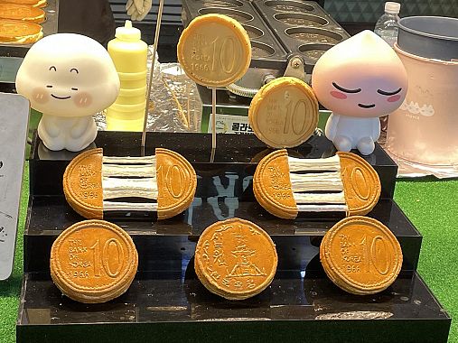 A onor di cronaca peró la leccornia piú gettonata sono i pancake a forma di moneta da 10 won che vedete qui sotto. Sono ripieni di un formaggio filante che i sudcoreani chiamano, guarda un po', mozzarella ma l'impasto della cialda è dolce, anche troppo. I sudcoreani li adorano.