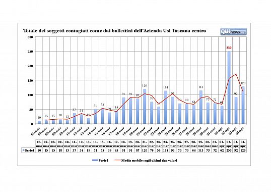 FIRENZE — Nell'area della Asl centrale i casi positivi sono saliti a 2332 mentre sono 1626 nella sola zona di Firenze e provincia. Secondo i dati forniti dalla Regione Toscana al Dipartimento della Protezione civile i dati sono in miglioramento anche se il bollettino resta drammatico come dimostrano i 18 decessi delle ultime 24 ore, quattro dei quali nel fiorentino: si tratta di un uomo di 85 anni, una donna di 95 anni, una donna di 80 anni ed un uomo di 64 anni tutti domiciliati a Firenze.