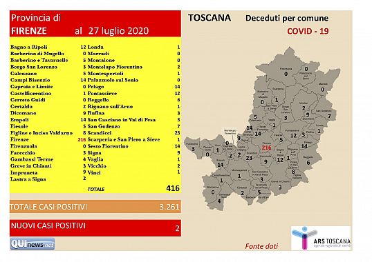 FIRENZE — Nell'ultimo bollettino sanitario della Ausl centrale sono emersi 3 nuovi casi positivi nelle ultime 24 ore, due i casi in provincia di Firenze, uno a Bagno a Ripoli ed uno a Pontassieve. Sono 3.261 i casi complessivi ad oggi a Firenze.