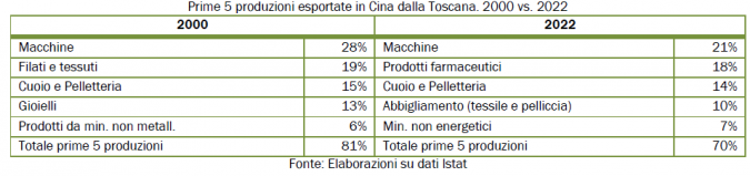 Dalla Cina la Toscana importa prevalente macchine (29%), filati e tessuti (12%).