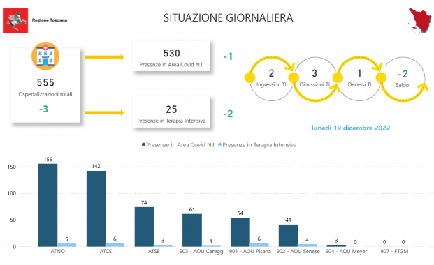 Gli attualmente positivi sono oggi 73.030, -0,8% rispetto a ieri. Diminuisce il numero dei ricoverati, oggi sono 555 (5 in meno rispetto a ieri), di cui 25 in terapia intensiva (2 in meno). Nel grafico sottostante e in quelli a corredo la situazione negli ospedali toscani.