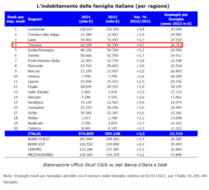 A livello regionale la Toscana si trova al quarto posto dietro a Lombardia, Trentino-Alto Adige e Lazio con un indebitamento medio a famiglia nel 2022 di 26.311 euro (+4,1% rispetto al 2021).