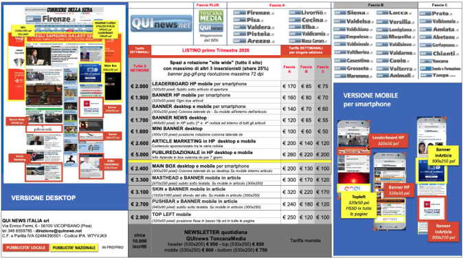 Per la pubblicità su ToscanaMediaNews.it e sul Network QuiNews.net invia una mail a direzione@quinews.net e sarai contattato dalla nostra struttura commerciale.