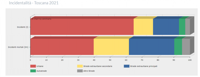 Nel 2021 sono state soprattutto le strade urbane il teatro di incidenti: 8.808 quelli che vi si sono verificati, tra cui 74 mortali. Altri 1.651 sinistri sono stati registrati su strade extraurbane secondarie, e 2.210 su strade sempre extraurbane ma principali. Le autostrade nei tratti toscani sono state la scena di 537 incidenti, mentre 390 sinistri sono accaduti su altre tipologie di strada.