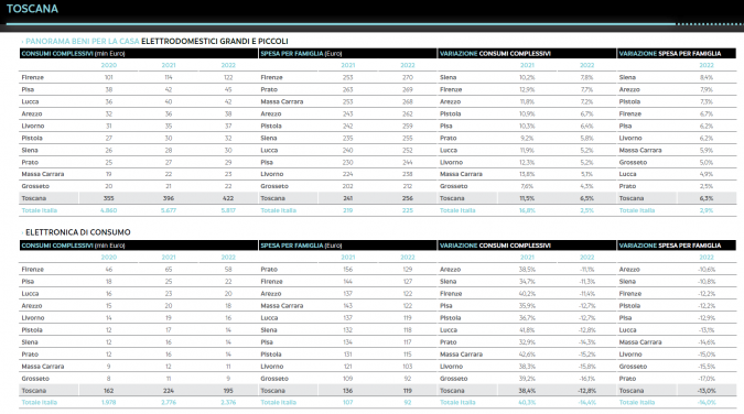 Nel quadro regionale, Firenze è al primo posto in tutti i comparti per quanto riguarda il volume di acquisti. Nel settore casa le famiglie hanno speso 362 milioni di euro in mobili (+6,9%), 126 milioni in prodotti di telefonia (+13,3%, la variazione percentuale più alta nel perimetro regionale), 122 milioni in elettrodomestici (+7,7%, secondo miglior dato in ambito nazionale), 59 milioni in information technology (-6,8%) e 58 milioni in elettronica di consumo (-11,4%).