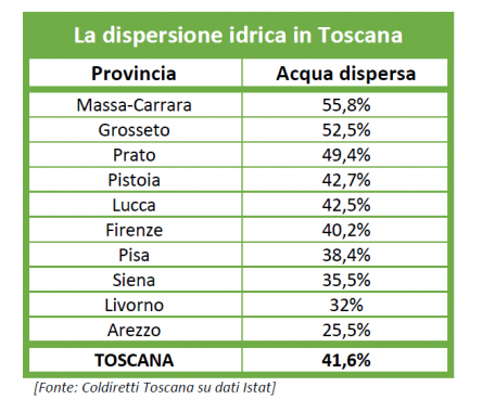E poi c'è la dispersione idrica. Secondo dati Istat, illustra Coldiretti Toscana, dal punto di prelievo al rubinetto la rete idrica sul territorio regionale toscano disperde il 41,6% dell'acqua, con differenze tra le diverse province. Si va dal 55,8% di perdite lungo il tragitto dell’acquedotto della rete di Massa-Carrara al 25,5% di Arezzo, ma perdite superiori alla media regionale si registrano anche a Grosseto (52,5%), Prato (49,4%), Pistoia (42,7%) e Lucca (42,5%) e perdite importanti di acqua non risparmiano nemmeno le province di Firenze (40,2%), Pisa (38,4%), Siena (35,5%) e Livorno (32%).