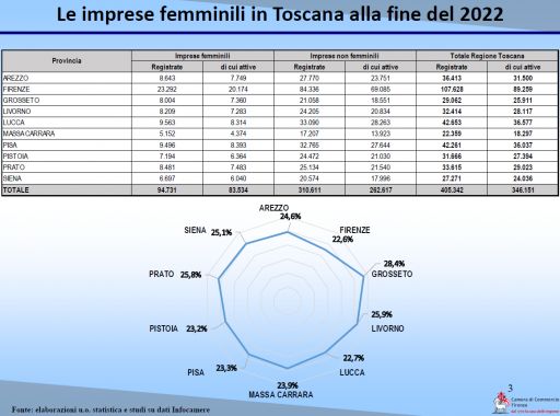 Il rapporto sulla demografia d'impresa in rosa è stato realizzato dall'ufficio studi della Camera di commercio di Firenze cristallizzando i dati alla fine del 2022. Chiuso nel Marzo scorso, censisce in Toscana 94.731 imprese femminili registrate, 83.534 quelle attive il 66,5% delle quali imprese individuali. Le società di capitale sono il 19,8%, mentre il 70% delle imprese femminili attive svolgono attività nel ramo dei servizi e/o del commercio.