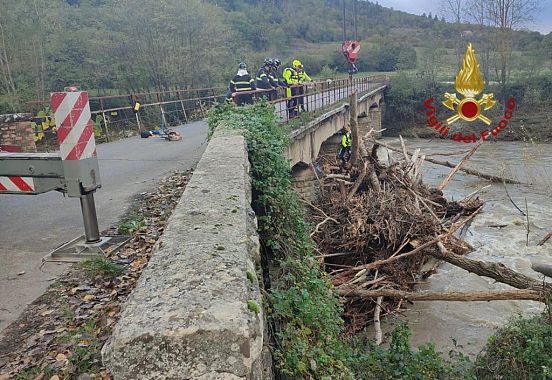 A Bibbiena le squadre sono state impegnate anche a disostruire il ponte da tronchi e detriti che impedivano il passaggio dell'acqua: gli operatori fluviali si sono calati dal ponte per operare.
