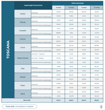 Per quanto riguarda i restanti comuni e province, i prezzi sono stabili ovunque, anche se viene evidenziato il +1,7% della provincia di Massa-Carrara dove cresce del +27% la domanda, a fronte di un calo dello stock di oltre il 10%.