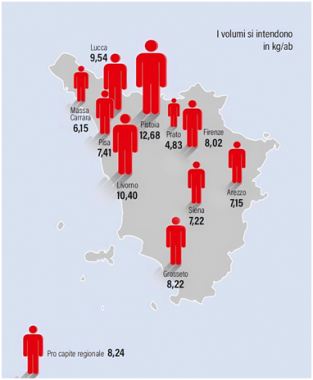 Si posizionano tutte nelle prime 35 posizioni nella graduatoria nazionale, con valori molto alti e ben al di sopra della media dell’area (6,21 kg/ab) e di quella nazionale (6,12 kg/ab) i valori di quasi tutte le restanti province: Lucca al 9° posto con 9,54 kg/ab (-7,4%), Grosseto al 19° con 8,22 kg/ab (-12,6%), Firenze al 23° con 8,02 kg/ab (+1,2%), Pisa è 32esima con 7,41 kg/ab (-9,7%), seguita da Siena al 34° posto con 7,22 kg/ab (-7,8%) e da Arezzo al 35° con 7,15 kg/ab (-11%).